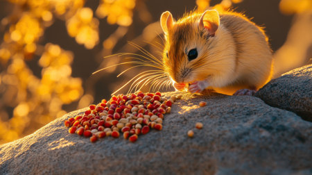 This enchanting image captures a small rodent on a rock, savoring seeds against a backdrop of golden autumn leaves lit by soft sunlight. The scene portrays peacefulness and connection to nature.