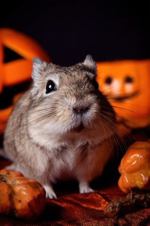 A small rodent stands among Halloween pumpkins and decorations showcasing a playful expression. The setting is festive and colorful.