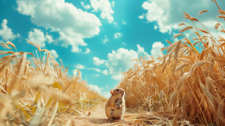 Card with hampster stands on path in wheat field. Blue sky with clouds. Horisontal frame.