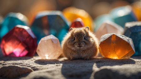 AI Generated. A small fat fluffy creature which looks out curiously between two huge crystals