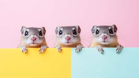 Three cute chipmunks are curiously peeking over a colorful wall, creating a funny and adorable scene