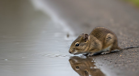 A small wood mouse or rodent drinks from a puddle on a paved road surface. The animal's reflection is mirrored in the water, capturing a rare moment of wildlife adapting to an environment with a soft, blurred background.