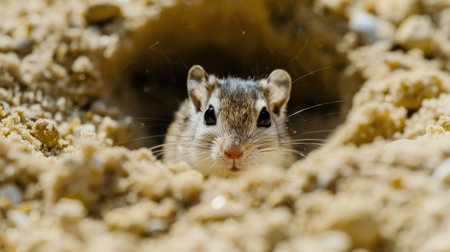 A small desert rodent sits amidst the sands, its eyes wide with curiosity.