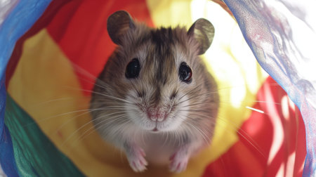 A captivating image of a cute hamster peeking out from a colorful toy tunnel. This adorable pet exhibits a joyful expression, perfect for showcasing fun animal moments.