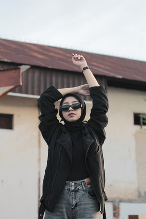 A young Asian woman wearing a hijab and jeans posing outdoors, following a concept with a black outfit