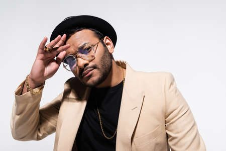 stylish indian hip hop performer in fedora hat and eyeglasses gesturing while looking at camera isolated on grey