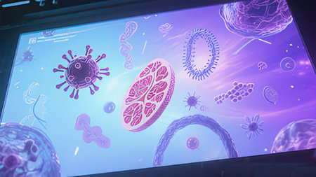 Colorful cartoon bacteria are animatedly fighting with antibodies in a lively and colorful microscopic environment filled with details.