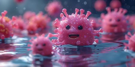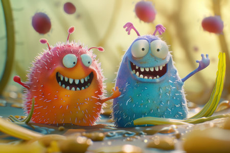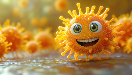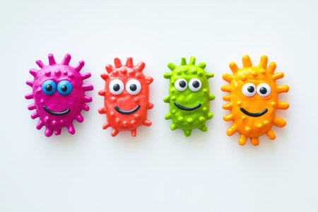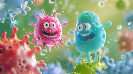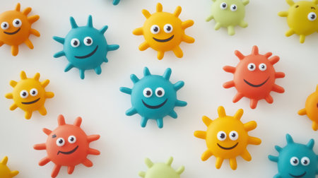 Colorful microbes with expressive eyes and smiles spread joy across a clean surface, showing vibrant colors and friendly features.