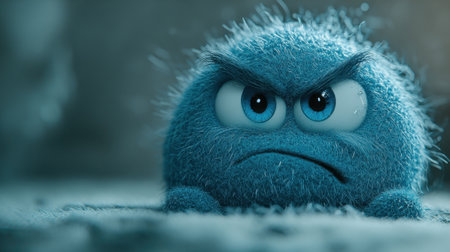 A small, fluffy blue character with large expressive eyes and a frowning mouth displays clear signs of anger. The textured background enhances the character's emotional state, creating a dramatic atmosphere.