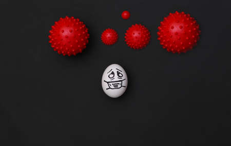 The egg face in a medical mask and virus strain on black background. Covid-19 pandemic. top view