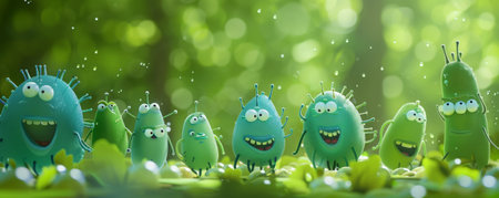 Cute, animated bacteria characters with happy expressions, standing in a group on a lively green background, highlighting their adorable and fun nature.