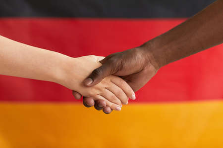Close-up of people shaking hands against the German flag