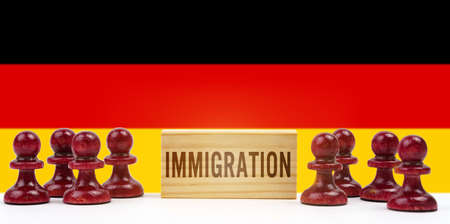 The concept of national economy. Against the background of the flag of Germany are pawns and a sign with the inscription - immigration