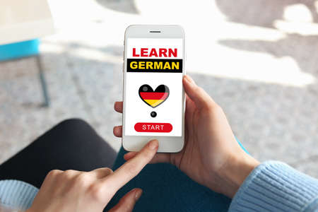 Young woman with mobile phone studying German online, closeup