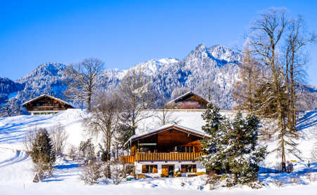 Snow-covered mountains over Alpsee is a lake in Ostallgau district of Bavaria, Germany, located about 4 kilometres southeast of Fussen. It is close to the Neuschwanstein and Hohenschwangau castles.
