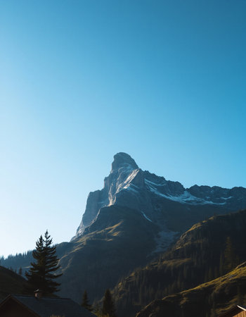 Beautiful mountain landscape with snow-capped peaks and conifer forest