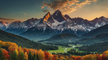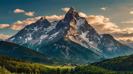 Sunset in the mountains with coniferous forest and snow-capped peaks