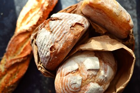 Bakery products. Crispy, beautiful bread on a dark background. Top view, copyspace. Bread background.