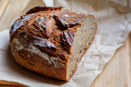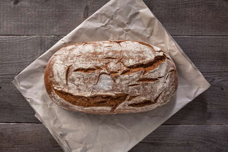 A fresh, crunchy, delicious rye bread on a wrinkled paper and a wooden chopping board