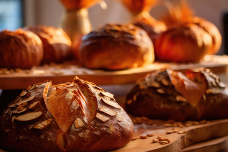 close-up of freshly baked artisan bread loaves, created with generative ai