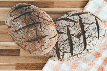 directly above view of two loaves of pure rye sourdough bread on wooden surface