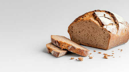 A close-up shot of a whole rustic bread loaf and two slices, showcasing its crusty exterior and soft interior, with crumbs scattered around.