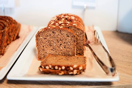 Fresh whole grain seeded bread, organic wheat flour, closeup slice texture as background for food blog or cook book recipes