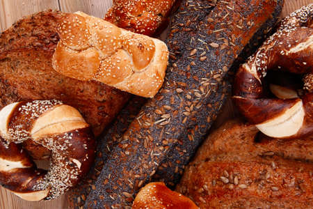 Various of baked bread on wooden table background