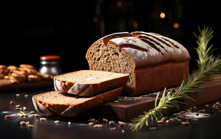 Homemade bread loaf with seeds on dark backdrop. Perfect rustic bakery and food photography concept.