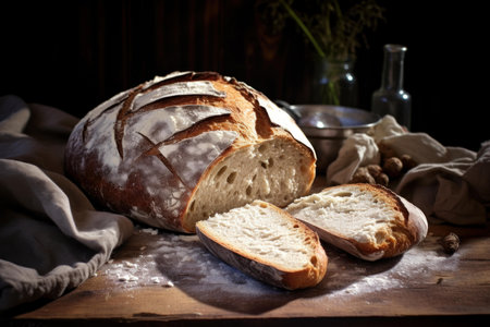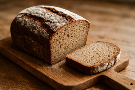 A beautifully sliced loaf of fresh bread on a rustic wooden cutting board, dusted with flour, capturing the warmth of home baking and culinary artistry.