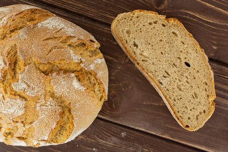 Group of one whole one slice of fresh baked rye wheat bread flatlay on brown wood