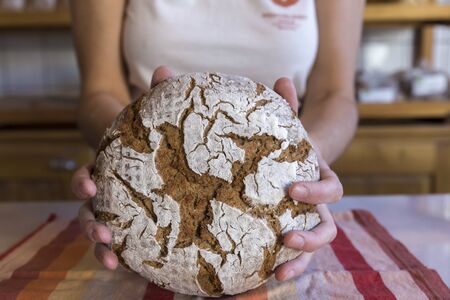 Baker holding organic bread bake bread rolls divided in half in hands - rural bakery, moody still life.