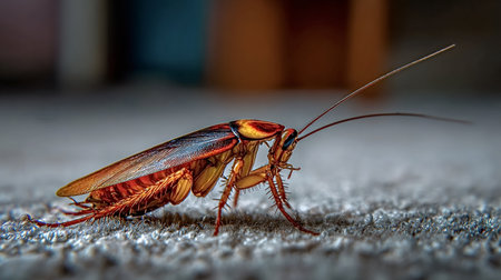 A detailed macro shot of a cockroach showcasing its features an urban setting.