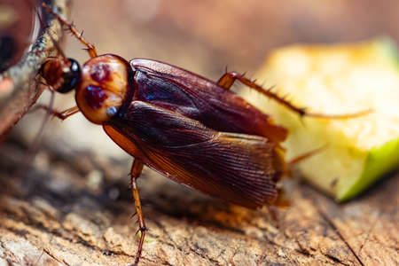 American cockroach on the floor, eating dirt crumbs, inside the kitchen, cockroach flying indoors, closeup