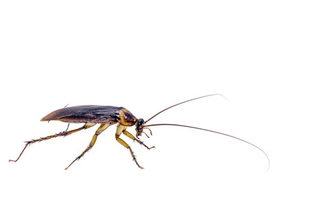 Cockroach isolated on a white background. Pest insect. Concept of infestation, pest control, hygiene, domestic cleanliness, extermination, sanitation. Banner. Copy space