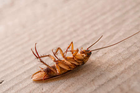 A dead cockroach upside down. Close up. Wood motif floor background.
