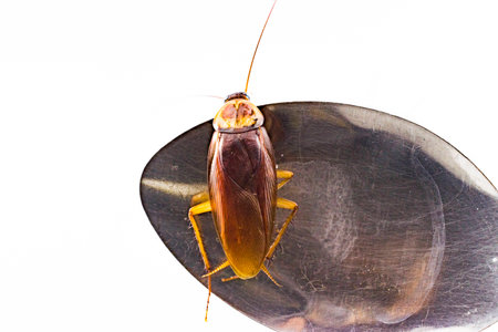 Selective focus to cockroach on plastic spoon with white isolate background. It crawling around the kitchen and home.