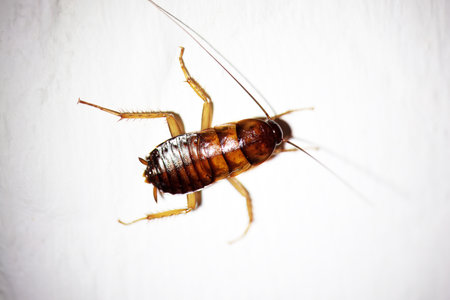 Dead cockroach lying on its back on white surface. Pest insect. Perfect for pest control service ads, hygiene educational content, product labels for insecticides. Banner. Copy space