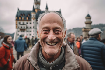 Abstract virtual people icons on flag of Germany and sunset sky background. Life and health insurance concept. Multiexposure