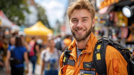 a team of professional paramedics rushes to help. People in red uniforms. Big special blurred ambulance car races through bustling streets of City, beacon of hope and help in times of need.