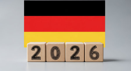 Germany flag with 2026 wooden blocks on gray background for future concepts.