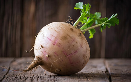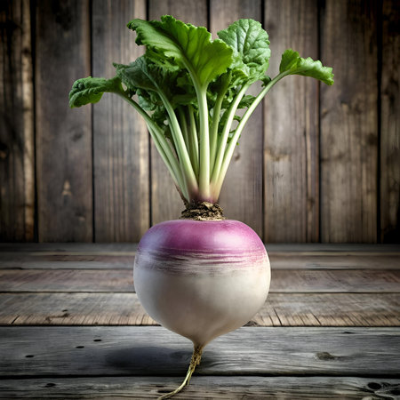 A fresh. vibrant turnip with lush green leaves stands proudly on a rustic wooden surface. Perfect for illustrating healthy eating. gardening. or farm to table concepts.