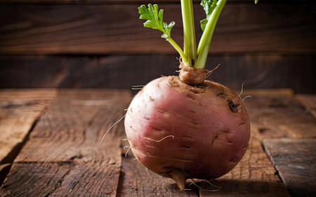 A vibrant, unpeeled rutabaga showcases deep purple-stemmed foliage, resting on weathered wooden planks, evoking fresh, wholesome ingredients for nourishing dishes.