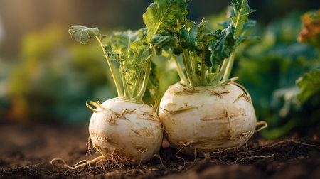 Fresh White Turnips Growing in Rich Soil, Ready to Harvest Soon