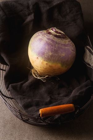 Fresh turnip on wooden table. Dark rustic style image.