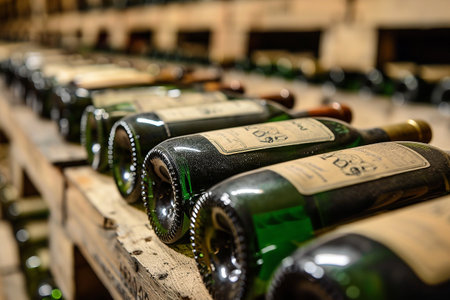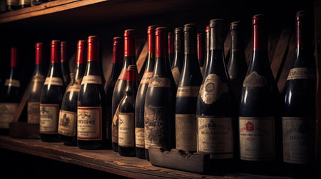close-up view of red wine bottles on a vintage wooden shelf. Perfect for conveying the rustic winery atmosphere and the essence of winemaking tradition.
