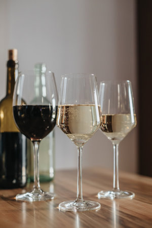 Three glasses of red and white wine on the table next to a bottle of wine. House party