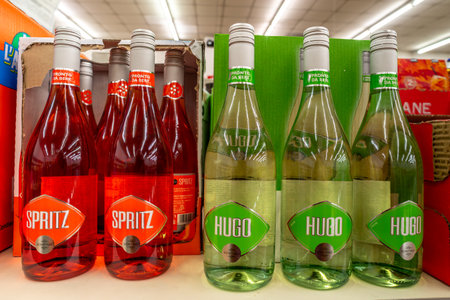 Italy - July 13, 2023: Spritz aperitif cocktails and Spritz Hugo ready to drink in bottles displayed for sale on the shelf in Italian discount stores