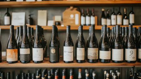 Wine bottles are presented on shelves in a retail environment. The image showcases various bottles with labels and varying colors. Soft lighting illuminates the bottles, highlighting their shapes and textures. This image is suitable for commercial applications related to beverage industry, retail, or lifestyle content.