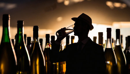 Silhouette of man drinking alcohol amidst many full bottles, AI generated image